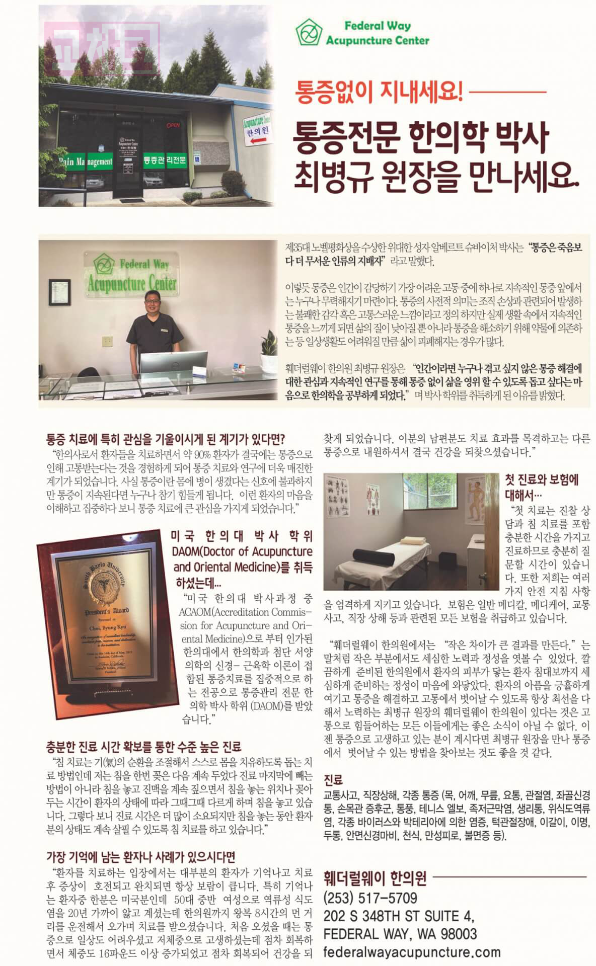 [훼더럴웨이 한의원] 통증전문 한의학 박사 최병규 원장을 만나세요