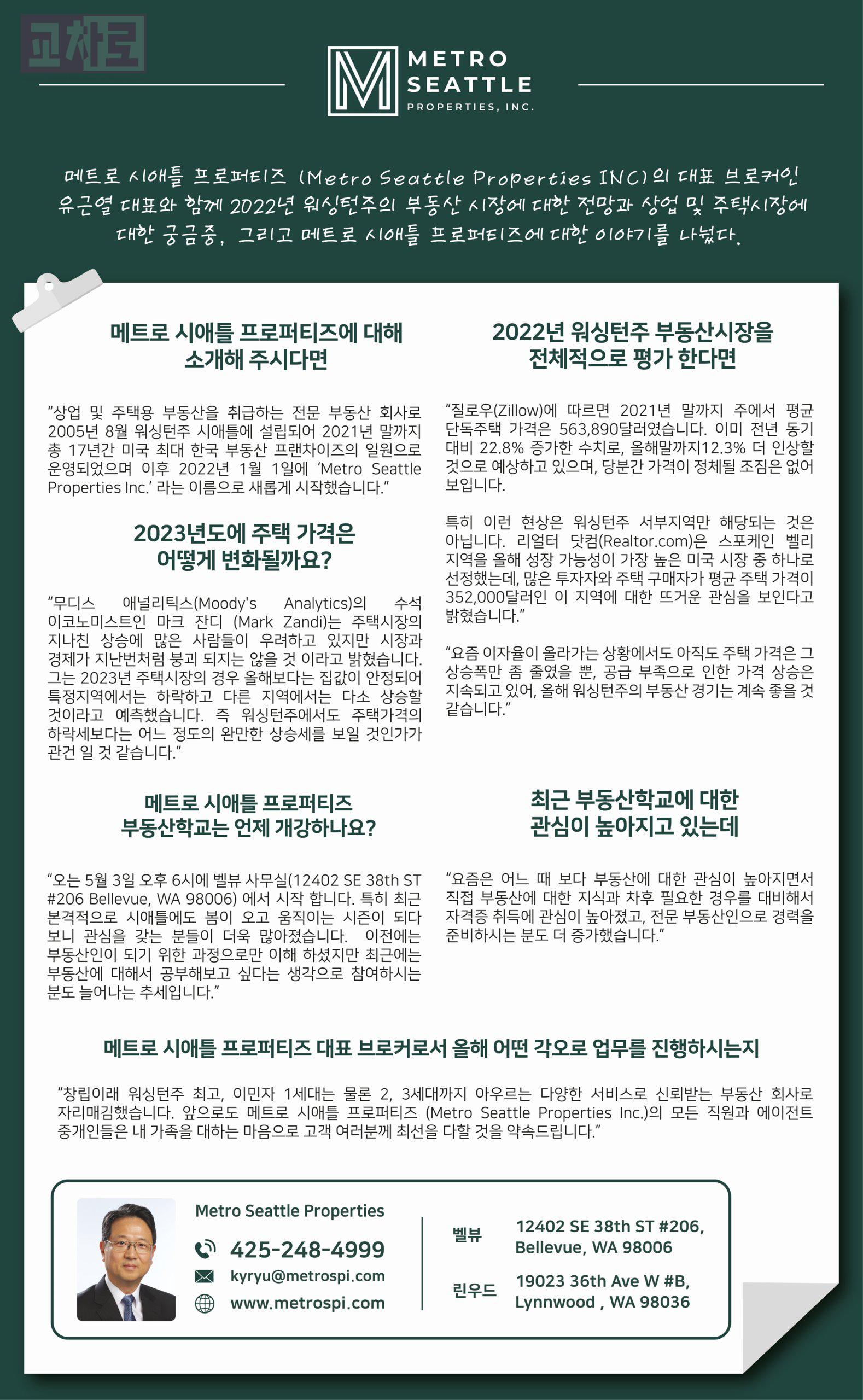 [메트로 시애틀 부동산] 유근열 대표, 부동산 이야기
