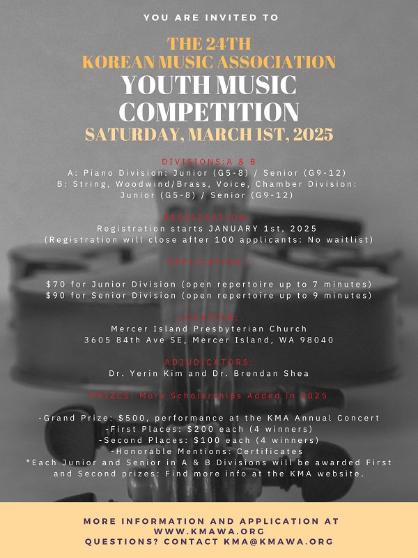 워싱턴주 한인음악협회(회장 김유진)가 주최하는 ‘제24회 청소년 음악 콩쿨’이 오는 3월 1일 머서 아일랜드 장로교회(3605 84th Ave SE, Mercer Island, WA 98040)에서 개최된다.