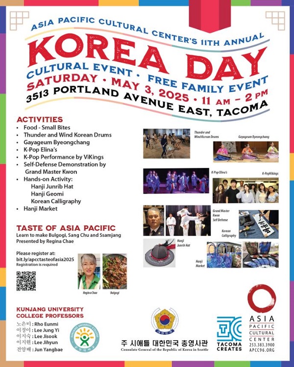 아태문화센터(APCC)가 오는 5월 3일 토요일 오전 11시부터 오후 2시까지 타코마 본관(3513 Portland Avenue East)에서 제11회 ‘한국의 날(Korea Day)’ 행사를 개최한다.