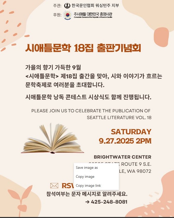 한국문인협회 워싱턴주 지부(회장 박보라)는 협회지 <시애틀문학> 18집을 발간하고, 오는 9월 27일(토) 오후 2시 우딘빌에 있는 브라이트워터 환경 교육 커뮤니티 센터에서 […]