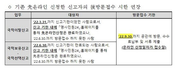 “2022년 3월31일까지 온라인으로 국적이탈을 접수한 민원인은 2022년 9월 30일까지 공관에 방문하여 수수료 납부 및 서류제출이 가능하다.”라고 전했다.
