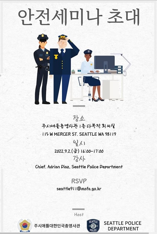시애틀총영사관(총영사 서은지)이 9월2일 오후 4시 영사관 다목적홀에서 시애틀 경찰국장 아드리안 디아즈를 초대해 안전세미나를 개최한다.