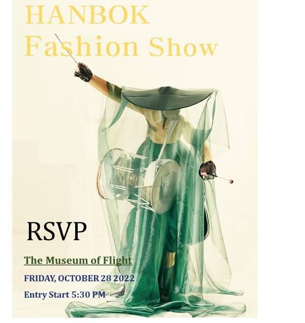 주시애틀 대한민국 총영사관(총영사 서은지)은 오는 10월 28일 금요일 오후 5시 30분부터 시애틀 항공 박물관(Museum of Flight, 9404 E Marginal Way S, Seattle, WA 98108)에서 한복 패션쇼 및 한국전통문화 공연을 개최한다.