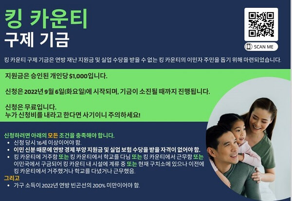 킹 카운티 구제기금은 연방 재난 지원금 및 실업 수당을 받을 자격이 안되는 서류 미비자들을 돕기 위해 마련된 것으로, 승인된 지원자에게는 개인당 $1,000가 지급된다.