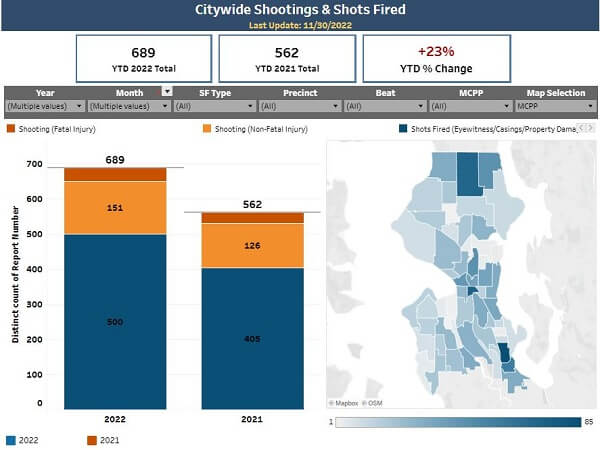 시애틀 경찰국의 데이터에 따르면 2022년 시애틀에서 총격으로 인한 사망자가 38명, 부상자는 151명으로 이는 전년 동기 대비 23% 증가했다.