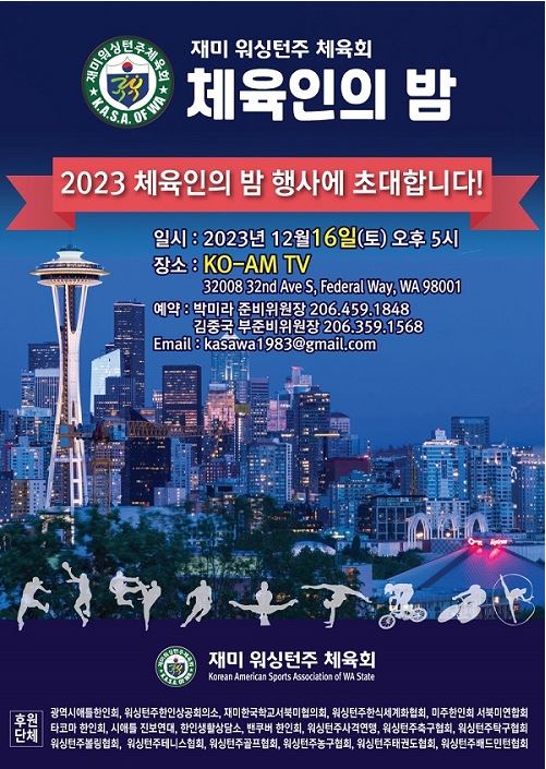 재미워싱턴주 체육협회가 오는 12월 16일 페더럴웨이 코엠 TV 방송국 강당에서 ‘2023년 재미워싱턴주 체육인의 밤’ 행사를 개최한다.