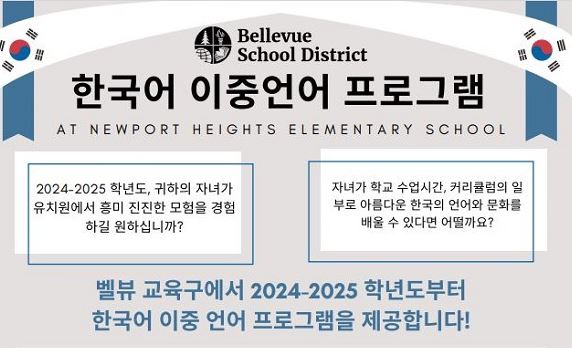 주시애틀총영사관(총영사 서은지)은 벨뷰 교육구(교육감 Kelly Aramaki)의 뉴포트 하이츠 초등학교(Newport Heights Elementary School)에서 운영 중인 한국어 이중언어 프로그램이 확대될 것이라고 밝혔다.