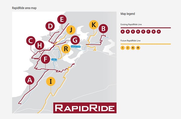 킹 카운티 메트로의 레피드라이드 노선은 지정된 버스 전용 차선을 이용해 교통체증을 피하고, 피크 시간대에는 10분 간격으로, 주말에는 15분 간격으로 운행된다.