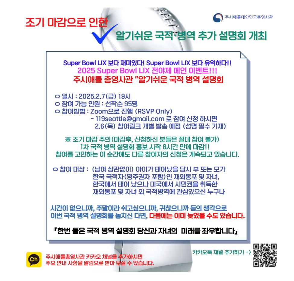 주시애틀총영사관은 1차 알기 쉬운 국적병역 설명회의 조기마감으로 인해 추가 설명회를 2.7(금) 19시 실시한다. 「알기 쉬운 국적·병역 설명회」는 국적·병역으로 인해 발생하는 재외동포들과 자녀들의 피해 예방을 예방하고자 개최한다.