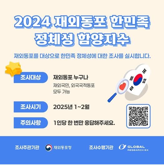 재외동포청 측은 “응답하신 내용은 향후 재외동포청의 사업계획을 수립하는데 큰 도움이 될 것”이라고 조사에 대한 적극적인 참여를 부탁 했다.