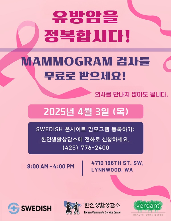 이번 행사는 스웨디시 암센터(Swedish Cancer Institute), 한인생활상담소(KCSC), 버던트 헬스 커미션(Verdant Health Commission)이 공동 주최하며, 조기 검진을 통해 유방암을 예방하고 조기에 발견하는 것을 목표로 한다.
