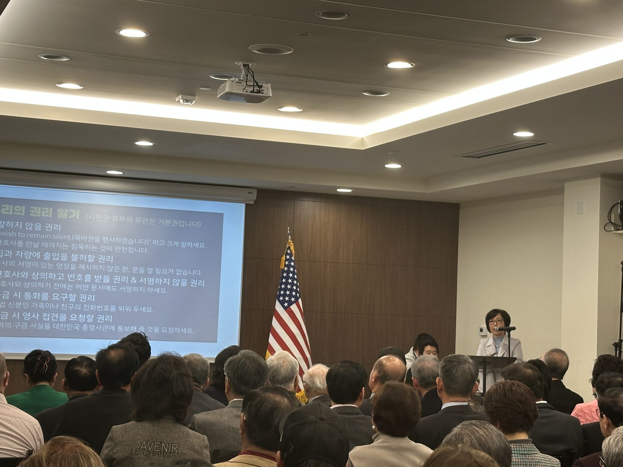 행사의 마지막 순서로 한인생활상담소 김주미 소장이 나와 트럼프 행정부의 이민단속국(ICE) 단속에 대한 대응 방법을 설명했다. 김 소장은 한인들이 반드시 알아야 할 법적 권리와 대처 방안을 상세히 안내하며, 이민자들이 불안 속에서도 보호받을 수 있도록 한인 사회가 연대하고 지원해야 한다고 강조했다.