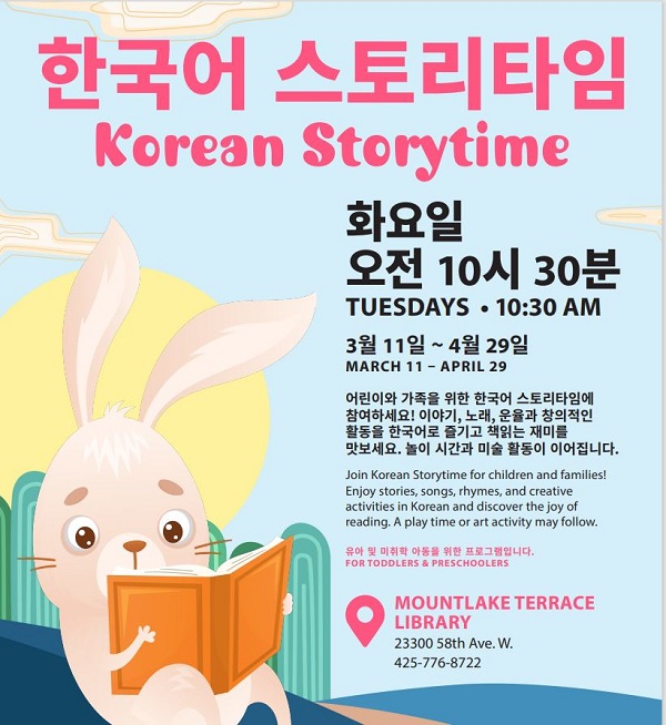 스노아일 도서관 산하 마운트레이크 테라스 도서관(Mountlake Terrace Library)이 오는 3월 11일부터 매주 화요일 오전 10시 30분부터 11시 30분까지 ‘어린이를 위한 한국어 스토리타임’ 프로그램을 무료로 운영한다.