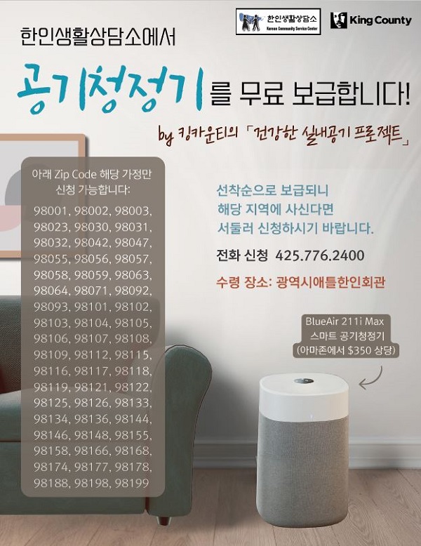 총 150개의 공기 청정기를 보급할 예정으로, 우선 3월에 광역 시애틀 한인회 회관에서 선착순으로 50개의 공기 청정기를 보급하니, 원하는 한인들은 먼저 아래의 해당 Zip Code에 거주하고 있는 지를 반드시 확인하고 한인생활상담소 전화(425) 776-2400)로 전화하여 신청하면 수령 날짜와 시간에 대한 자세한 안내를 받을 수 있다.