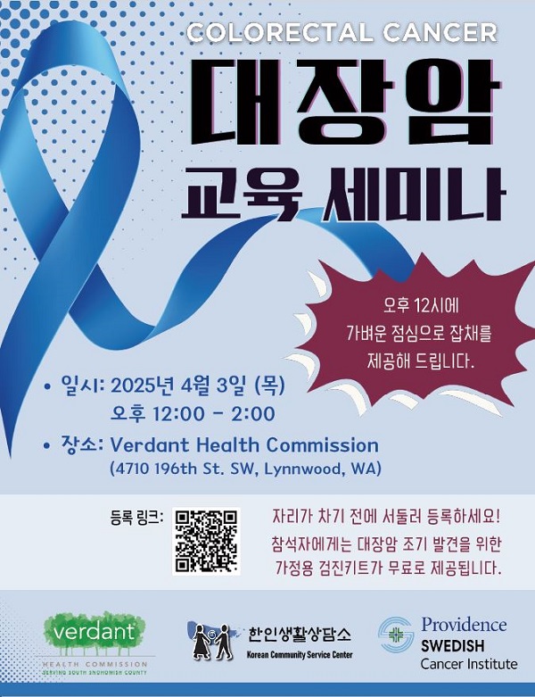 대장암 예방과 건강한 생활을 위한 워크숍이 오는 2025년 4월 3일(목) Verdant Community Wellness Center에서 개최된다.