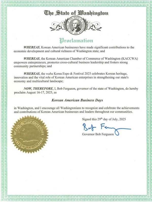 밥 퍼거슨(Bob Ferguson) 워싱턴주 주지사는 ‘2025 와바 코리아 엑스포 & 페스티벌(WABA Korea Expo & Festival)’을 맞아, 한인 커뮤니티가 지역사회와 경제, 문화 발전에 기여한 바를 기념하는 공식 선언문을 발표했다.