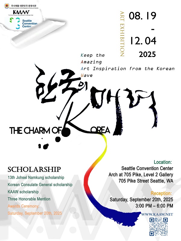 KAAW가 주최하는 ‘THE CHARM OF KOREA’ 회원 정기전시회는 8월 19일부터 12월 4일까지 시애틀 컨벤션 센터 아크(705 Pike, Level 2 Gallery)에서 열린다.
