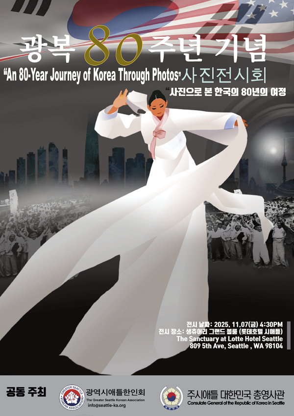 이날 행사와 함께 ‘사진으로 본 한국의 80년 여정(An 80-Year Journey of Korea Through Photos)’ 특별사진전도 열린다. 이번 사진전은 광역시애틀한인회(회장 김원준)와 시애틀총영사관이 공동으로 주최하며, 김원준 회장이 직접 기획을 주도했다. 전시는 일제 강점기부터 현대 한국의 성장과 민주화, 그리고 세계 속의 대한민국으로 도약하기까지 80년의 역사를 사진으로 조명한다.