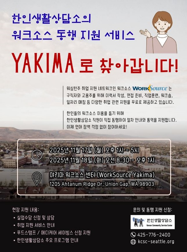 특히, 야키마 지역에 거주하는 한인들을 위해 한인생활상담소 직원들이 11월 17일 오후 1시부터 5시, 11월 18일 오전 8시 30분부터 오후 1시까지의 일정으로 해당 지역 워크소스(1205 Ahtanum Ridge Dr, Union Gap, WA 98903)에서 실업수당 신청, 취업 관련 정보 제공뿐만 아니라 푸드 스탬프, 메디케어 세이빙스 프로그램 등의 신청서 작성 지원도 함께 진행할 예정이다.