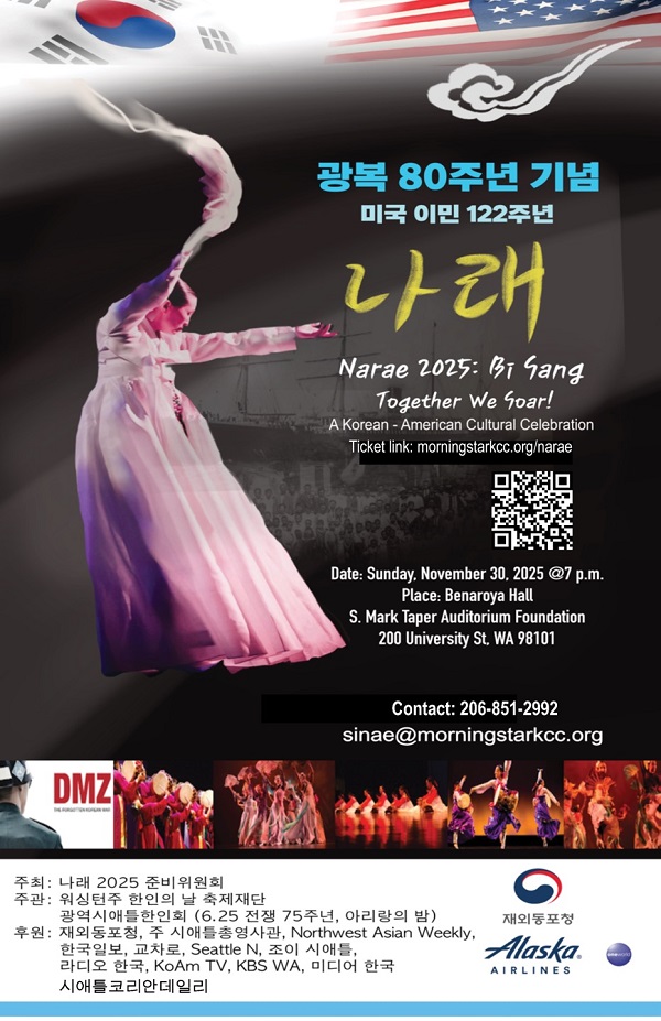 오는 11월 30일(주일) 오후 7시, 시애틀 다운타운의 베나로야 홀 대강당에서 한국문화 공연 ‘비상’이 무료로 열린다. 이번 공연은 광복 80주년, 6.25 한국전쟁 75주년, 그리고 미주 이민 122주년을 기념하여 마련된 특별 행사다.