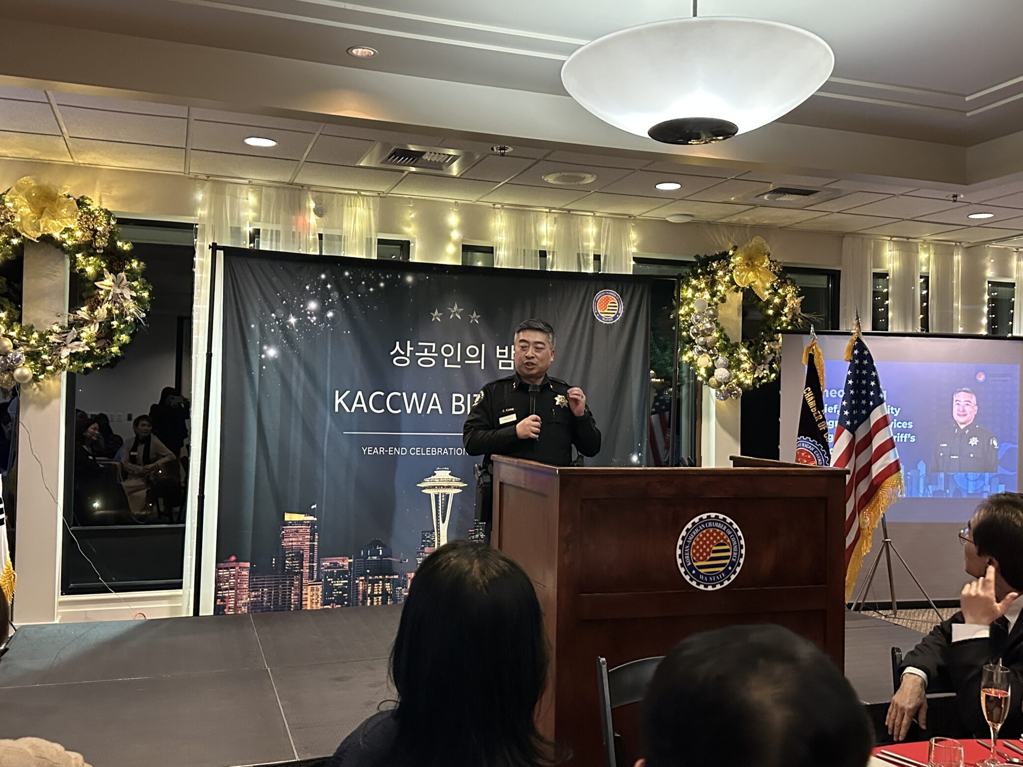 행사장에는 킹카운티 의회 5지구 스테파니 페인 의원, 킹카운티 셰리프국 커뮤니티 프로그램을 총괄하는 강 철 국장, 워싱턴주 주지사실 산하 규제혁신지원국(ORIA)의 휴고 니콜라스 소기업 담당관, 주시애틀 대한민국 총영사관의 전종화 경제 영사 등이 함께 자리했다. 또한 워싱턴주 노동산업부, 국무장관실, 스노호미시 카운티 행정국 관계자들과 연방 하원의원 매릴린 스트릭랜드 사무실 관계자들도 참석해 상공회의소가 공공 정책 소통의 창구로 자리매김했음을 보여줬다.