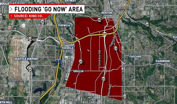 카운티 재난당국에 따르면, 제방 붕괴로 인해 생명을 위협할 정도의 급류가 발생할 수 있으며, 터킬라·렌턴(Renton)·켄트(Kent) 지역 그린 강 동쪽의 오릴리아(Orillia) 일대 주민과 사업체에 ‘즉시 대피(GO NOW)’ 명령이 내려졌다.
