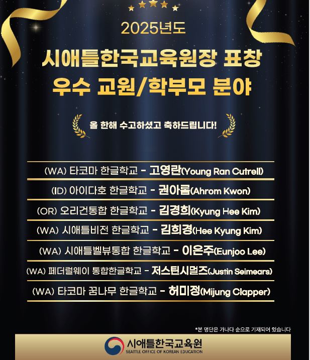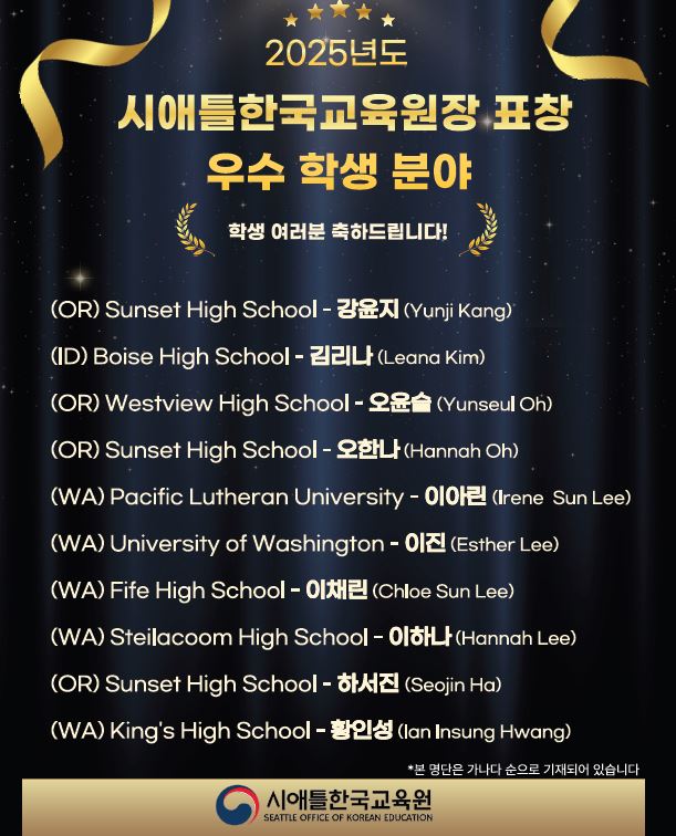 시애틀한국교육원(원장 이용욱)은 2025년 한 해를 마무리하며, 우수 동포학생 및 교원 등 표창 수여 대상자를 발표했다. 이번 표창은 시애틀한국교육원장 명의의 표창으로 한인으로서의 자긍심과 긍지를 높인 재외동포 학생 그리고 재외동포 교육에 공헌이 뚜렷한 교원 등 유공자를 발굴 및 격려하기 위해 마련되었다.