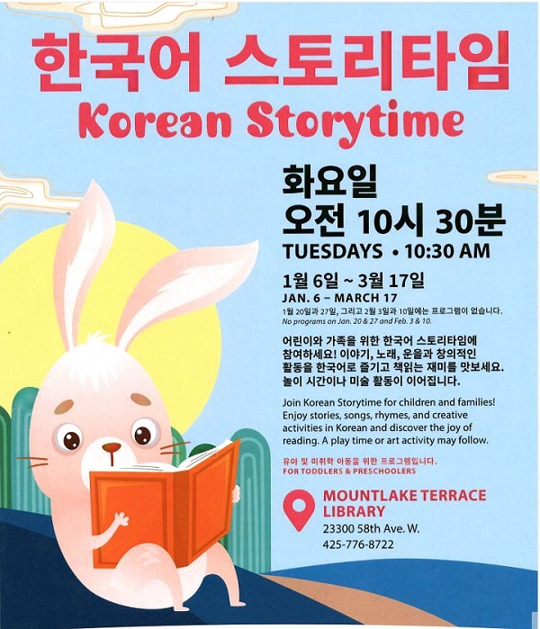 스노아일 도서관(Sno-Isle Libraries) 산하 마운트레이크 테라스 도서관(Mountlake Terrace Library)에서 어린이를 위한 한국어 스토리타임 프로그램이 새해를 맞아 시작된다.
