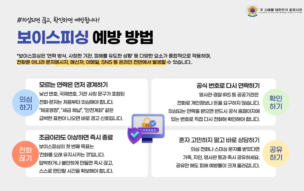 총영사관은 “한국뿐 아니라 미국의 공공기관 역시 전화나 온라인으로 직접 개인정보나 금융정보를 요구하지 않는다”며 “이런 전화를 받으면 당황하지 말고 즉시 통화를 종료해야 한다”고 강조했다. 또한 “보이스피싱이 의심되는 전화를 받았거나 피해를 입었을 경우, 즉시 거주지 관할 경찰서나 미연방통신위원회(FCC)에 신고해 달라”며 “피해 사실을 주변 지인들에게 적극적으로 알려 추가 피해 예방에 협조해 달라”고 당부했다.