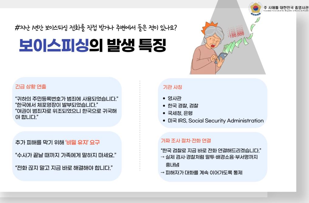 주시애틀총영사관은 최근 총영사관을 사칭한 금융사기 보이스피싱 및 이메일 피싱 사례가 다시 급증하고 있다며 한인 동포 사회에 각별한 주의를 당부했다.