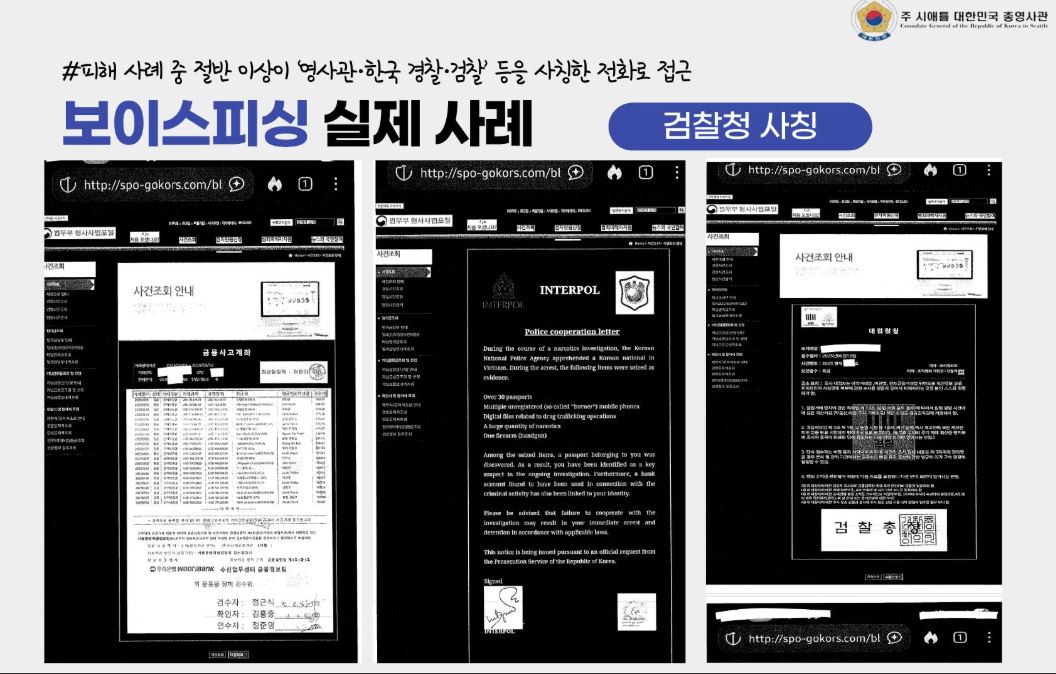 최근 시애틀총영사관 사칭 보이스피싱 주요 수법사기 사례에 따르면, 사기범들은 먼저 총영사관 번호로 전화가 온 것처럼 속인 뒤, 수신자의 실명을 부르며 “한국 법원에서 서류가 도착했다”, “마약 사건이나 대포통장 범죄에 연루됐다”고 겁을 주는 방식으로 접근한다.