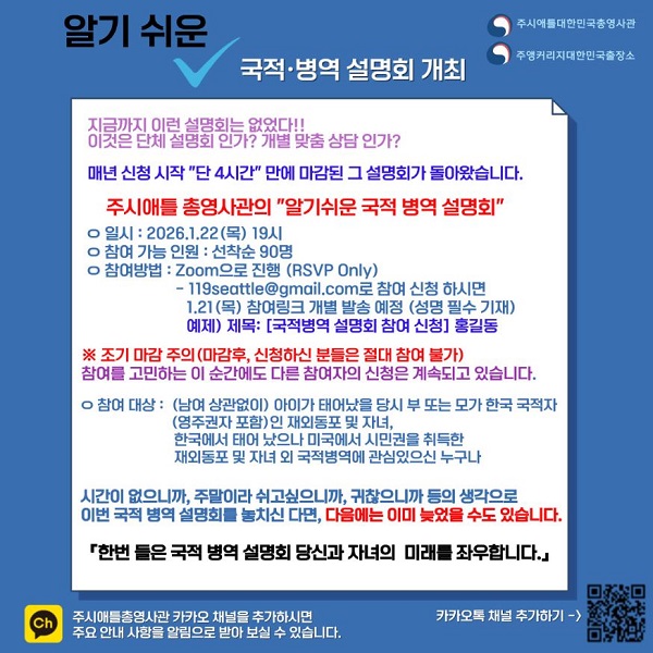 참여 인원은 선착순 90명으로 제한되며, 반드시 사전 RSVP 신청을 해야 한다. 신청은 이메일(119seattle@gmail.com)로 접수하며, 제목에 “[국적병역 설명회 참여 신청] 이름”을 적고, 본문에는 줌 링크를 받을 이메일 주소를 기재하면 된다. 신청자에 한해 1월 21일(수) 오후 줌 접속 링크가 발송될 예정이다.