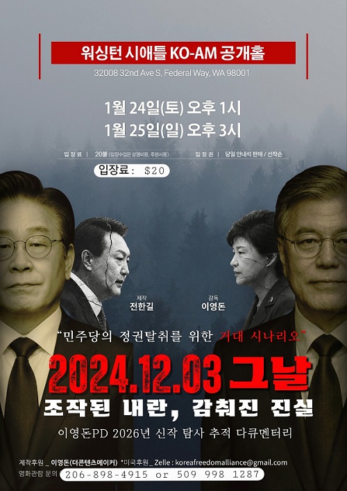 워싱턴 시애틀 지역에서 정치 다큐멘터리 영화 ‘2024.12.03 그날 – 조작된 내란, 감춰진 진실’ 공개 상영회가 이번 주말 이틀에 걸쳐 열린다.