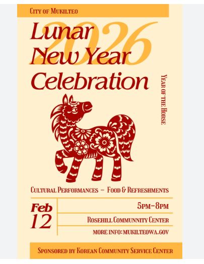 머킬티오(City of Mukilteo) 시는 다양성·형평성·포용성(DEI) 위원회와 공동으로 시 역사상 처음으로 2026년 구정 설날을 기념하는 ‘말의 해(Lunar New Year – Year of the Horse)’ 행사를 오는 2월 12일(목) 오후 5시부터 8시까지 로즈힐 커뮤니티 센터(Rosehill Community Center, 304 Lincoln Ave, Mukilteo, WA 98275)에서 개최한다.