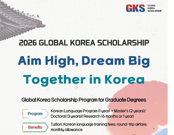 대한민국 정부가 해외 우수 인재 유치를 위해 운영하는 ‘글로벌 코리아 장학금(Global Korea Scholarship, GKS)’ 2026학년도 대학원 장학생 모집이 시작됐다. 등록금 전액과 항공료, 생활비 등을 포함한 전폭적인 지원이 제공되는 만큼 한국 유학을 희망하는 학생들에게 큰 기회가 될 전망이다.