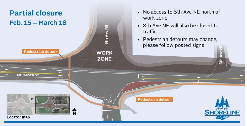 쇼어라인 시에 따르면 2월 15일 저녁부터 NE 145번가와 북쪽 I-5 진입로 사이의 5번가 북동쪽 구간이 폐쇄됐다. 해당 구간은 I-5 고가도로 새로운 로터리를 건설하기 위한 작업으로, 3월 말까지 통제가 이어질 예정이다.
