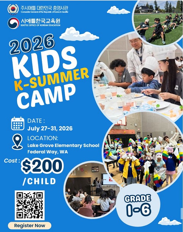 주시애틀 대한민국 총영사관과 시애틀한국교육원이 오는 7월 27일부터 31일까지 5일간 페더럴웨이 레이크 그로브 초등학교(303 SW 308th St, Federal Way, WA 98023)에서 「2026 K-SUMMER CAMP」를 개최한다.