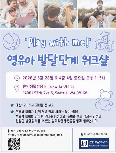 King County의 ‘Best Starts for KIDS’ 의 그랜트 지원을 받아 시행하는 교육 프로그램으로, ASQ (Age and Stage Questionnaires) 라는 미국의 공신력 있는 발달 단계 확인 프로그램으로 자녀들의 발달을 체크해보고, 발달 상태에 따른 조기개입의 중요성을 배우고, 또한 자녀들의 발달단계에 맞고, 발달을 촉진시켜줄 수 있는 놀이 방법과 상호작용 등을 배울 수 있는 내용으로 실제적인 workshop이 이어지는 프로그램이다.