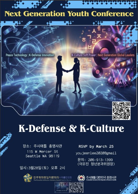 민주평화통일자문회의 시애틀협의회와 주시애틀총영사관은 오는 3월 28일 차세대 리더를 위한 ‘차세대 청년 컨퍼런스’를 개최한다고 밝혔다. 이번 행사는 K-방산과 K-문화 산업, 그리고 평화통일을 주제로 청년들에게 미래 비전을 제시하기 위해 마련됐다.