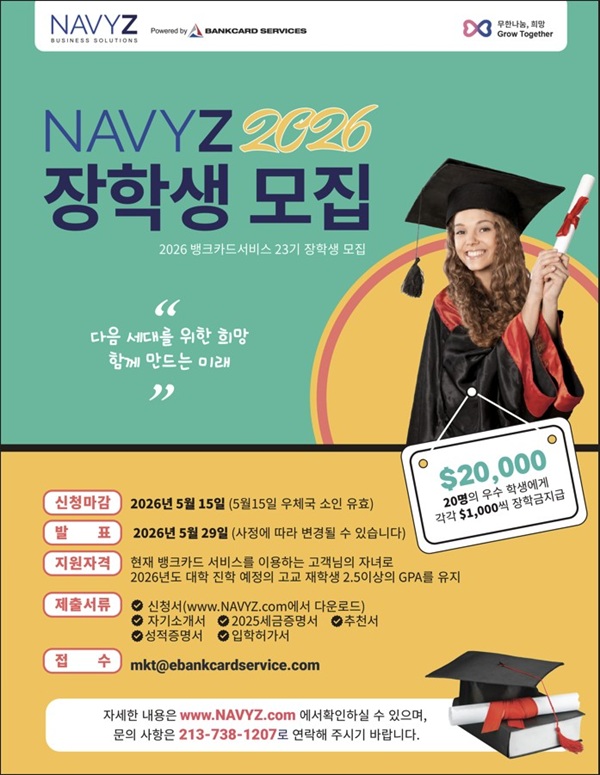 장학금 신청 문의: (213) 738-1207 이메일: mkt@ebankcardservice.com 웹사이트: www.navyz.com