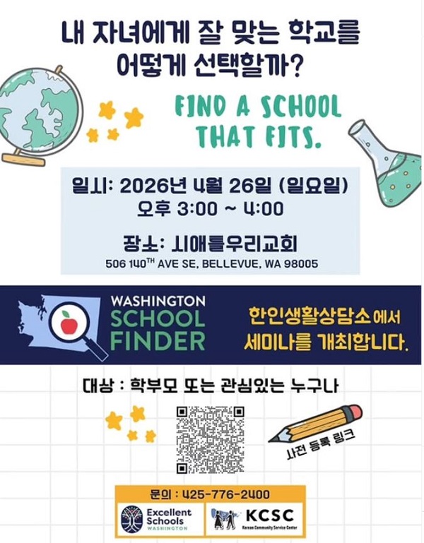 자녀의 교육 환경을 고민하는 학부모들을 위한 실질적인 학교 선택 가이드 세미나가 마련된다. 한인생활상담소(Korean Community Service Center, KCSC)는 오는 4월 26일 벨뷰에서 ‘내 자녀에게 잘 맞는 학교를 어떻게 선택할까(Find a School That Fits)’를 주제로 한 교육 세미나를 개최한다고 밝혔다.