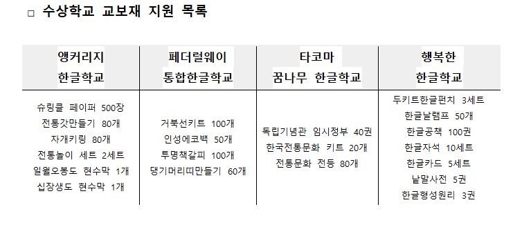 서북미 4개 한글학교 선정, 학교당 평균 총 100만 원 상당 교보재 지원