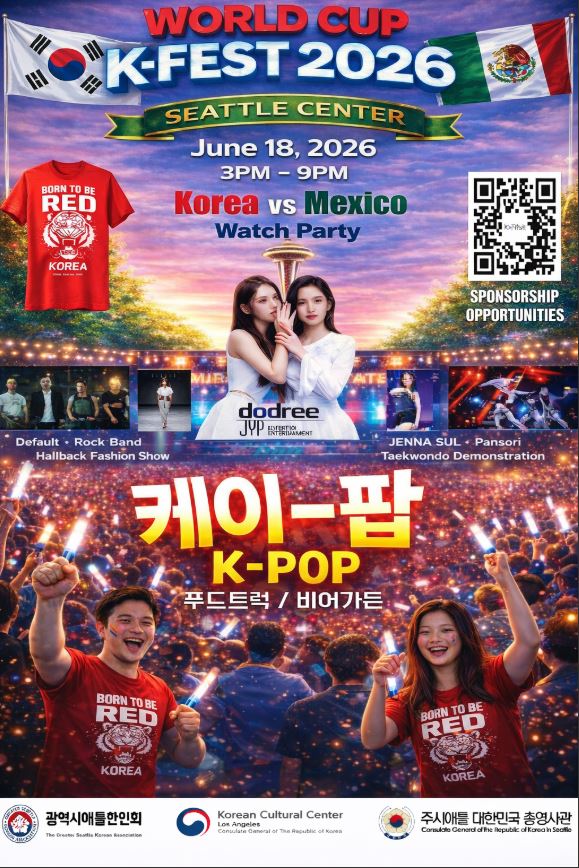 오는 6월 18일 오후 3시부터 9시까지 시애틀센터에서 ‘월드컵 K-페스트 2026(World Cup K-Fest 2026)’가 개최된다. 이번 행사는 한국과 멕시코의 월드컵 경기를 함께 관람하는 워치파티(Watch Party)를 중심으로, 다양한 한류 문화 콘텐츠를 결합한 복합 문화 축제로 마련된다.