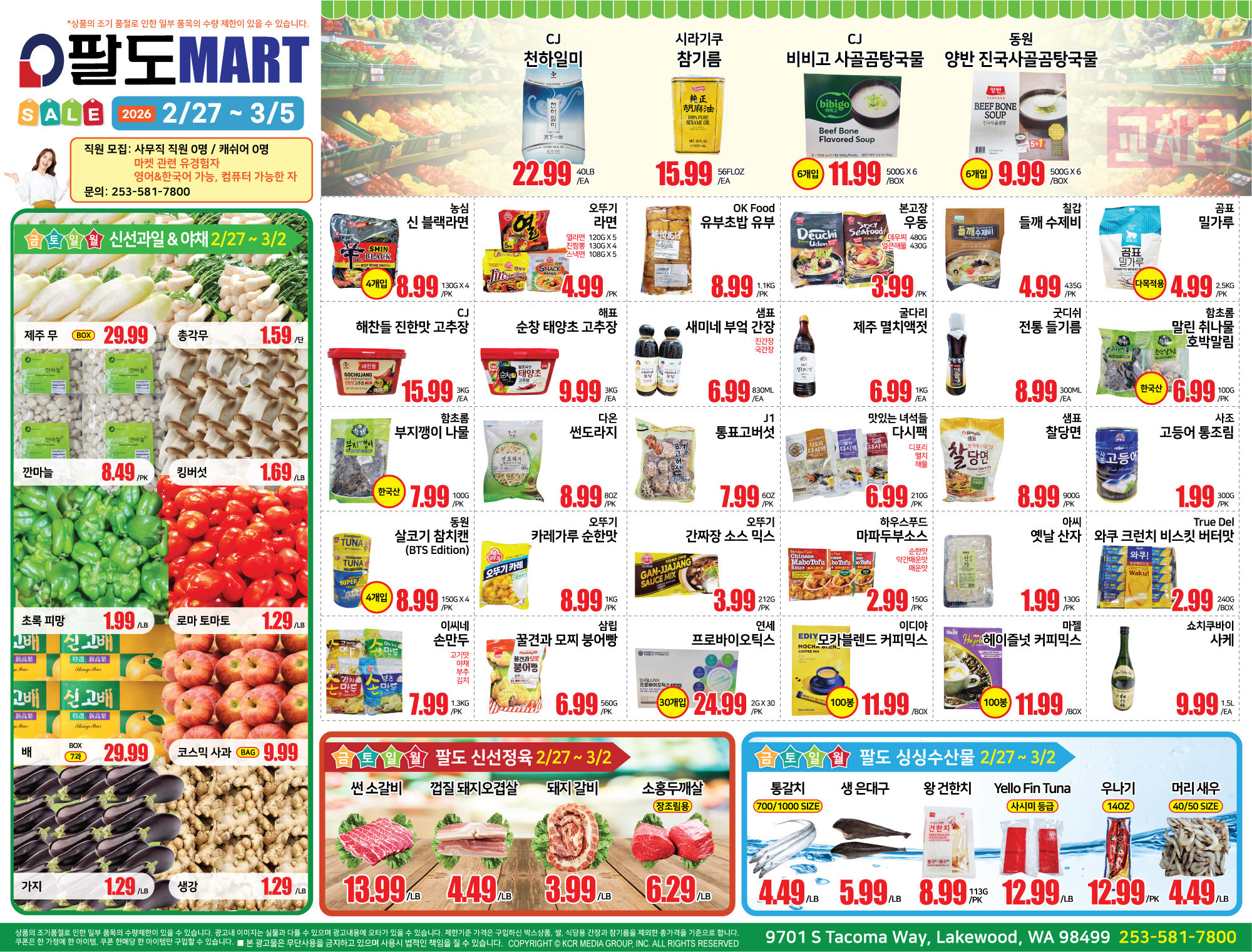 [팔도] 2.27~3.5 등록일 02.26.2026 @9:11 am 모든 사진 및 컨텐츠의 저작권은 KCR MEDIA GROUP, INC 에 있습니다. 모든 컨텐츠와 사진의 무단 도용및 재배포 사용을 금지합니다.Copyright © 2026 KCR Media Group, Inc. All rights Reserved