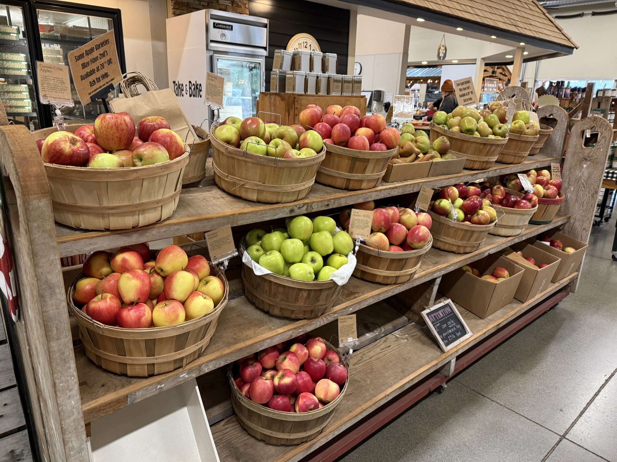 사과 시나몬 도넛, 애플 프리터, 홈메이드 파이 등은 방문객들에게 인기가 많다. 지역 재료로 만든 다양한 식사와 음료도 제공된다. 그릴은 오후 2시까지 운영되지만, 베이커리 제품과 음료는 오후 4시까지 즐길 수 있다.