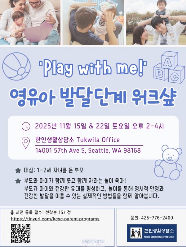 한인생활상담소(KCSC 소장 김주미)는 1세에서 2세 사이의 자녀를 둔 가족들을 대상으로 하는 11월 워크샵 시리즈에 부모님, 조부모님들을 초대한다. 일반적으로 자녀가 신생아에서 1-2세로 접어드는 과정에서 가장 큰 발달의 변화를 가져오기 때문에, 어떤 변화는 즐겁고 기대되지만, 어떤 변화는 어떻게 대처해야 하는지 고민이 […]