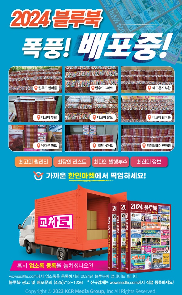 워싱턴주 최대 한인업소록 시애틀 교차로 ‘2024 블루북’이 발간되어 최근 폭풍 배포 중에 있다. 2023년 연말에 한국에서 배송되어 배포되기 시작한 ‘2024 […]