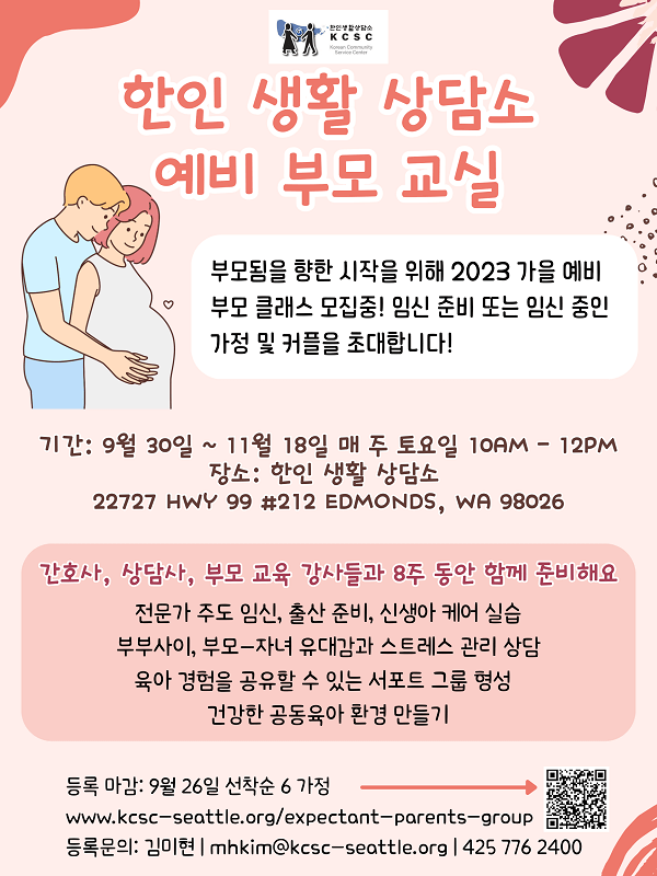 한인생활상담소(김주미 소장)는 9월 30일부터 11월 18일까지 진행하는 ‘2023년 가을 예비부모 클래스’에 참여할 임신 준비 또는 임신 중인 가정 및 커플을 […]