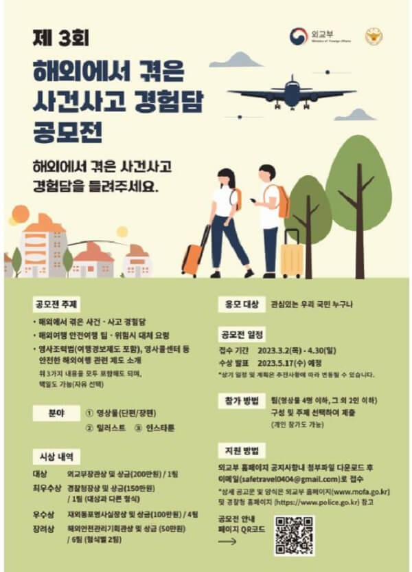 ㅇ 공모명 : 제3회 해외에서 겪은 사건사고 경험담 공모전 ㅇ 공모기간 : 2023.3.2.(목) – 2023.4.30.(일) (총 9주) ㅇ 공모주제 : […]